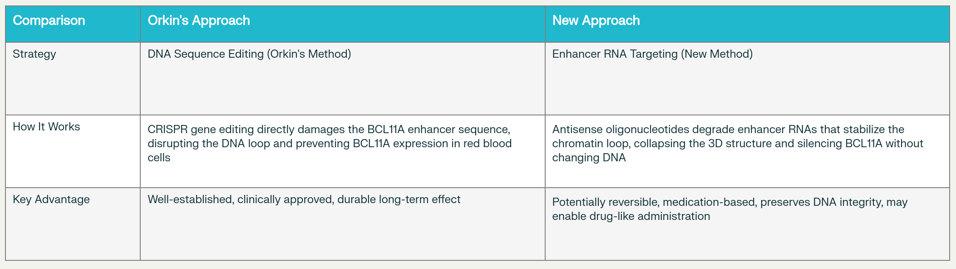 Para peneliti menemukan bahwa hemoglobin janin yang biasanya mati setelah lahir bisa diaktifkan kembali dengan memanipulasi sebuah 'saklar genetik' yang mengatur produksi hemoglobin. Dua metode populer adalah menggunakan teknologi CRISPR untuk mengubah DNA secara langsung dan terapi RNA untuk mengganggu struktur yang mematikan produksi hemoglobin janin tanpa merusak DNA.