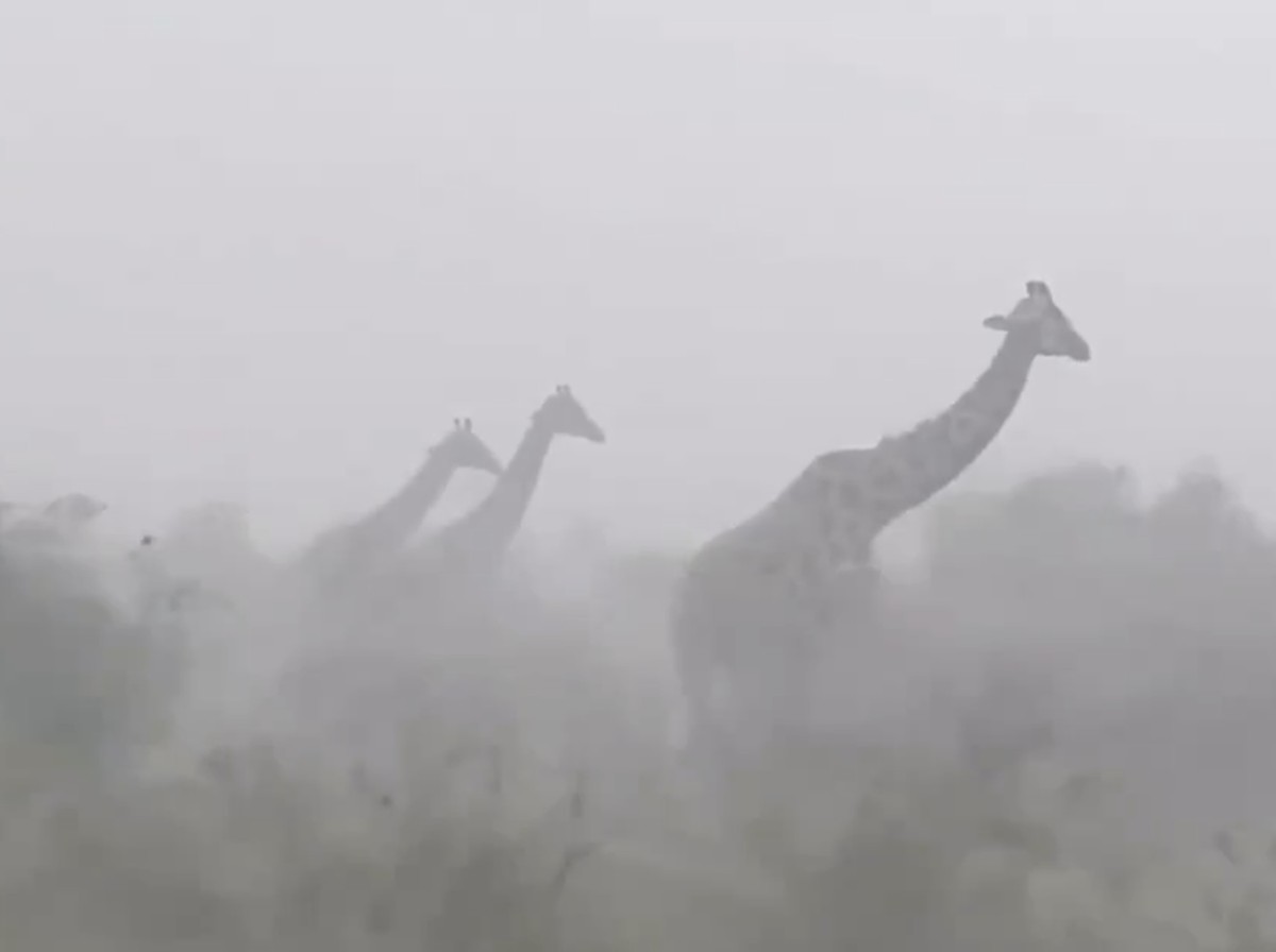 Video tersebut menunjukkan perjuangan jerapah bertahan di tengah badai dengan cuaca buruk.Q