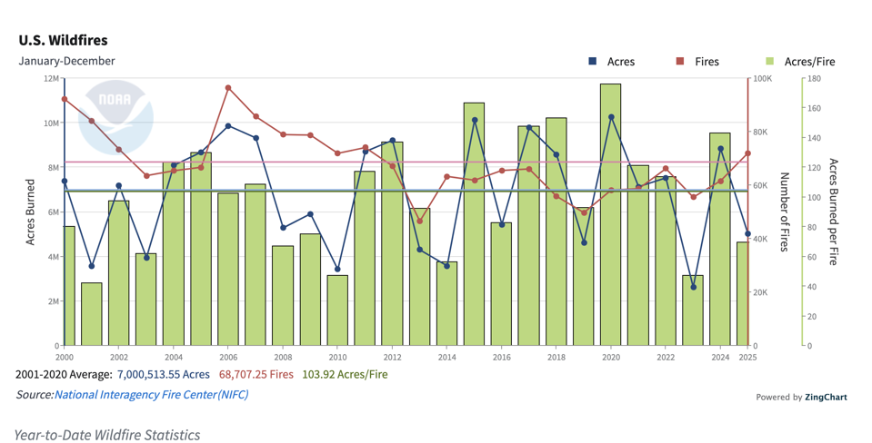 Data dari National Centers for Environmental Information menunjukkan bahwa tahun 2025 adalah tahun keempat terpanas dalam catatan 131 tahun, dengan jumlah kebakaran hutan yang melebihi rata-rata 20 tahun sebelumnya. Wilayah seperti Utah dan Nevada mencatat suhu terpanas sepanjang sejarah mereka, yang memperparah risiko kebakaran hutan di kawasan tersebut.
